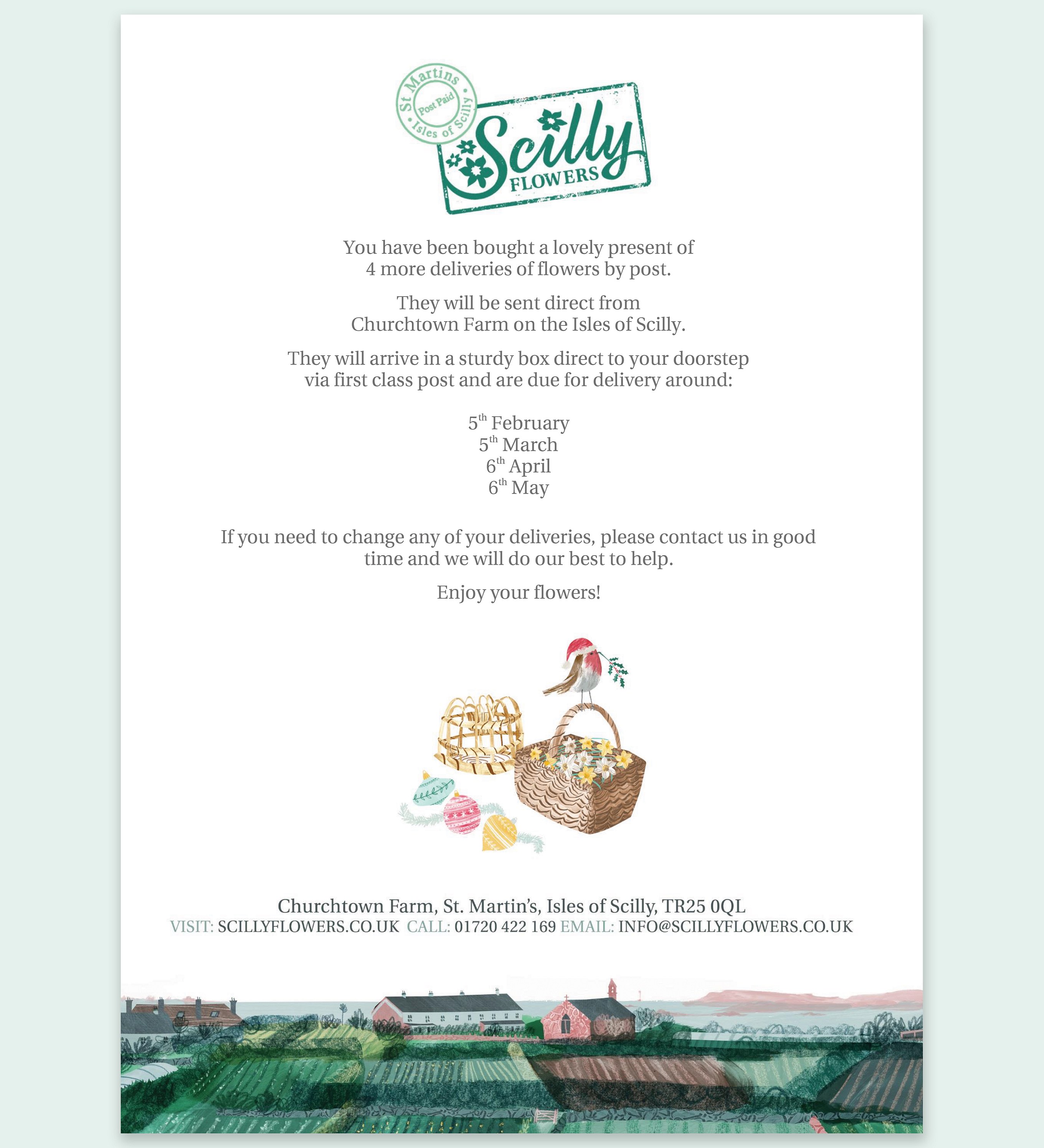 If you would like a gift letter from us explaining the present please let us know, we won't automatically send one. We can email it to you so you can print it out or we can put it in the post. A letter can be useful if you want to give it as a gift before the first delivery of flowers is due to arrive.