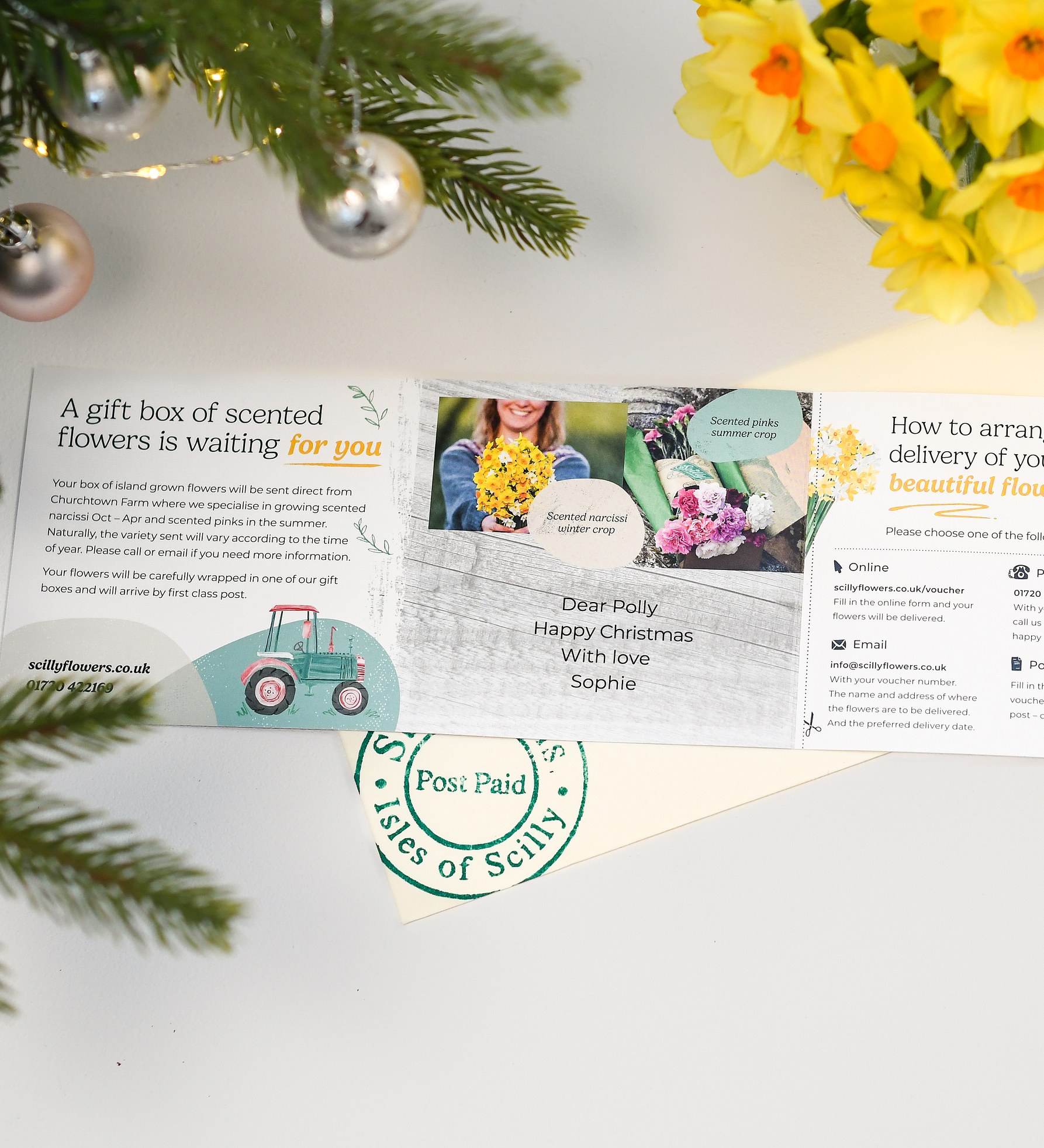 We will send an attractive gift voucher card with your Christmas greetings and in the New Year your friend can choose when to enjoy their flowers.