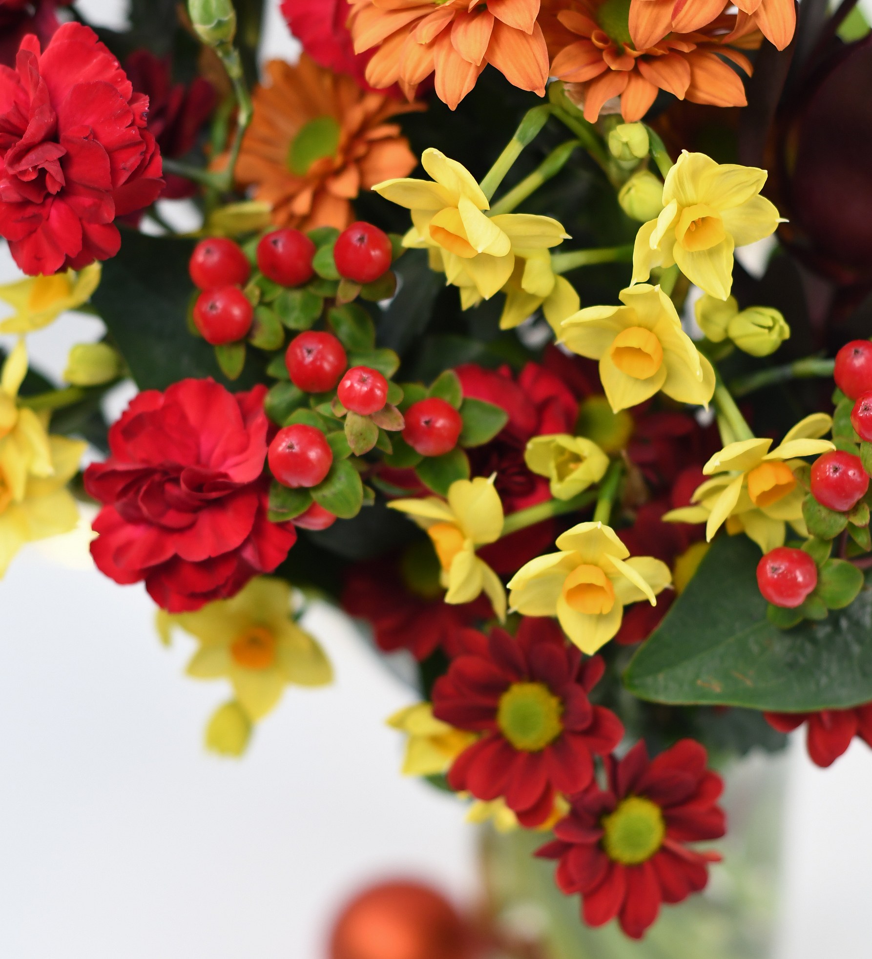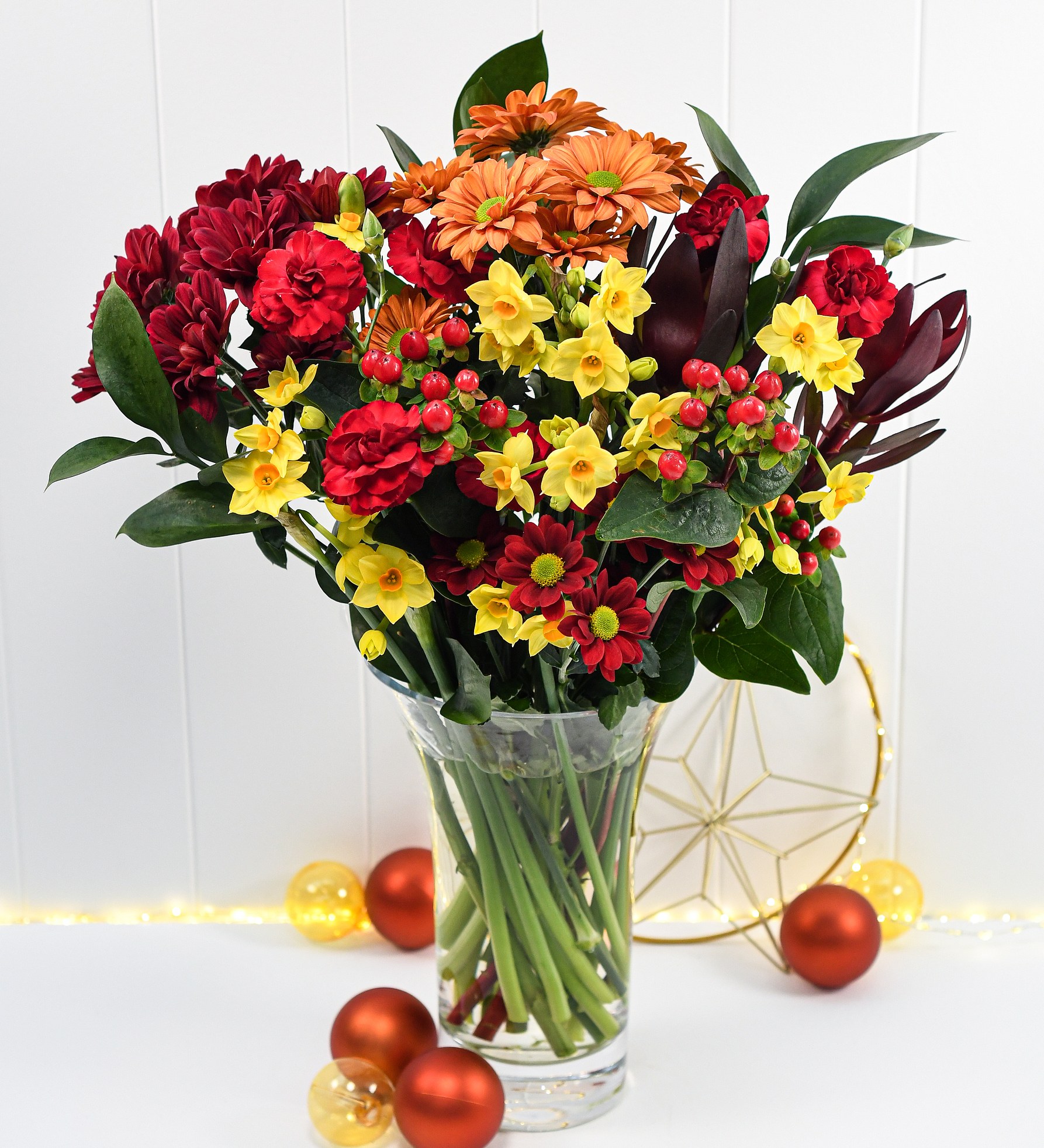 The festive posy bouquet has a traditional red theme with plenty of cheery yellow island grown scented narcissi. As well as scented narcissi in the bouquet you will find: rich red chrysanthemums, alstroemeria and festive berries combined with vibrant yellow craspedia and solidago all backed with wispy eucalyptus foliage.